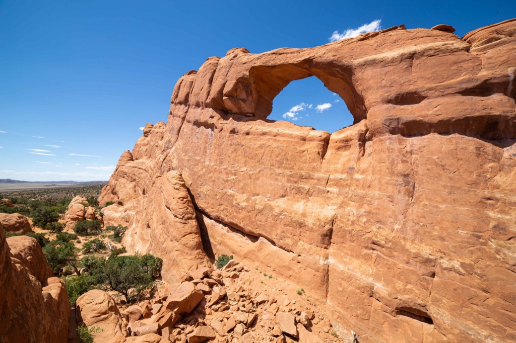 Next arch is the Pine tree arch. It’s not too far from the Tunnel arch. It’s a tall think arch. The trail leads to the arch and we can stand under it. The arch is named because pine tree is growing under the arch.
