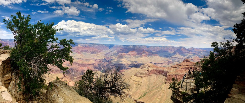 Mather Point is the closest viewpoint destination to the visitor center/canyon view plaza, a 5-10 minute walk. Due to the proximity to the visitor center, this is the most popular and crowded area of south rim. It is often the first stop for most of the south rim visitors who want to see the view of the red, colorful canyon. Mather point has two narrow ,railed overlooks.