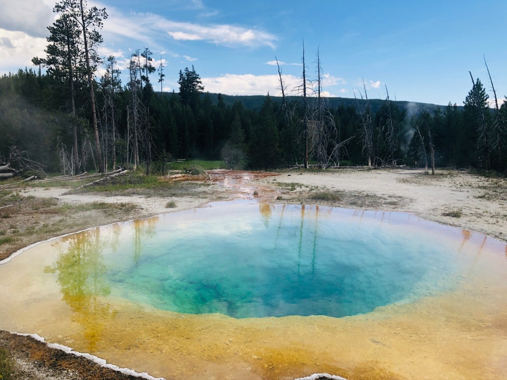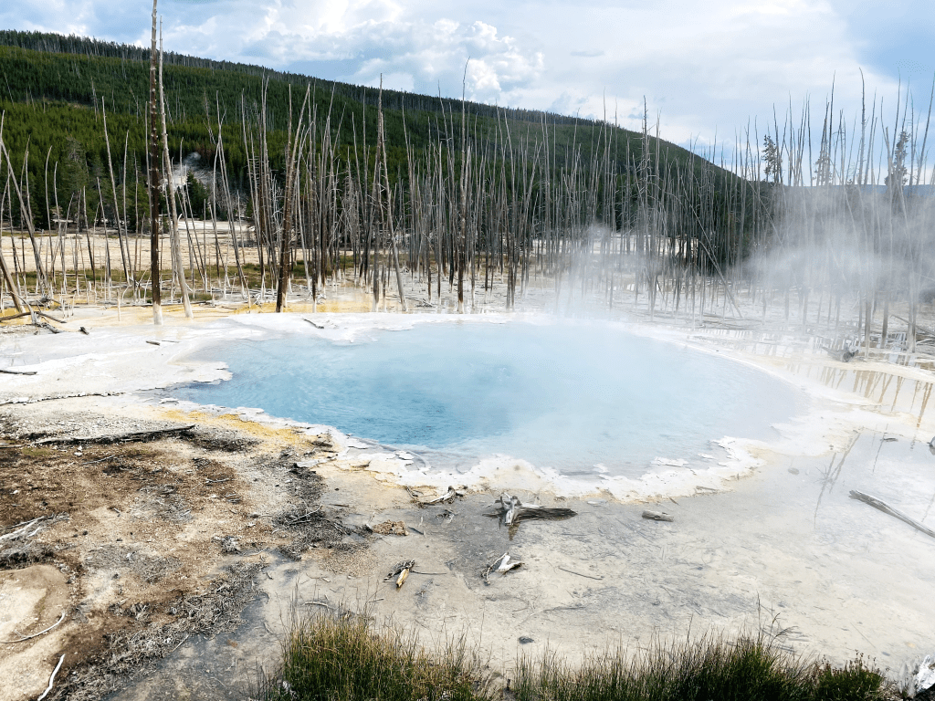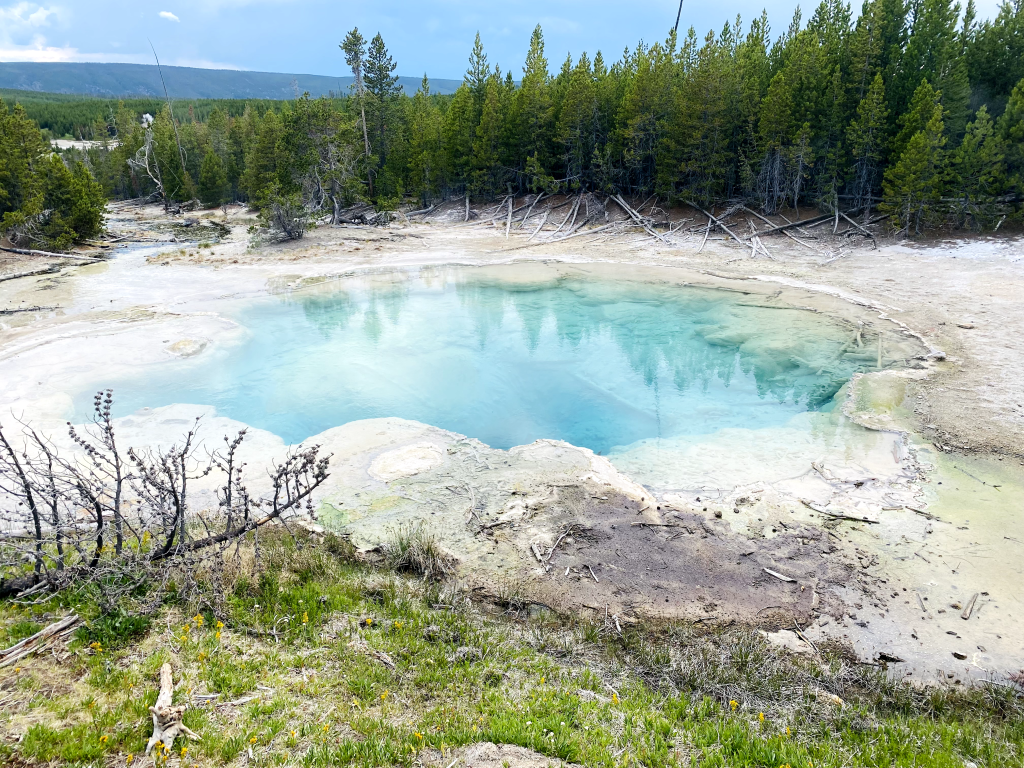 Next was Cistern Spring, which is connected to Steamboat Geyser. It drains when a major eruption of Steamboat happens. It pumps a lot of silica into the surroundings, much more than most of the other features in Yellowstone. We saw the trees nearby colored a grayish-white color. I think that is because of the silica from the spring.