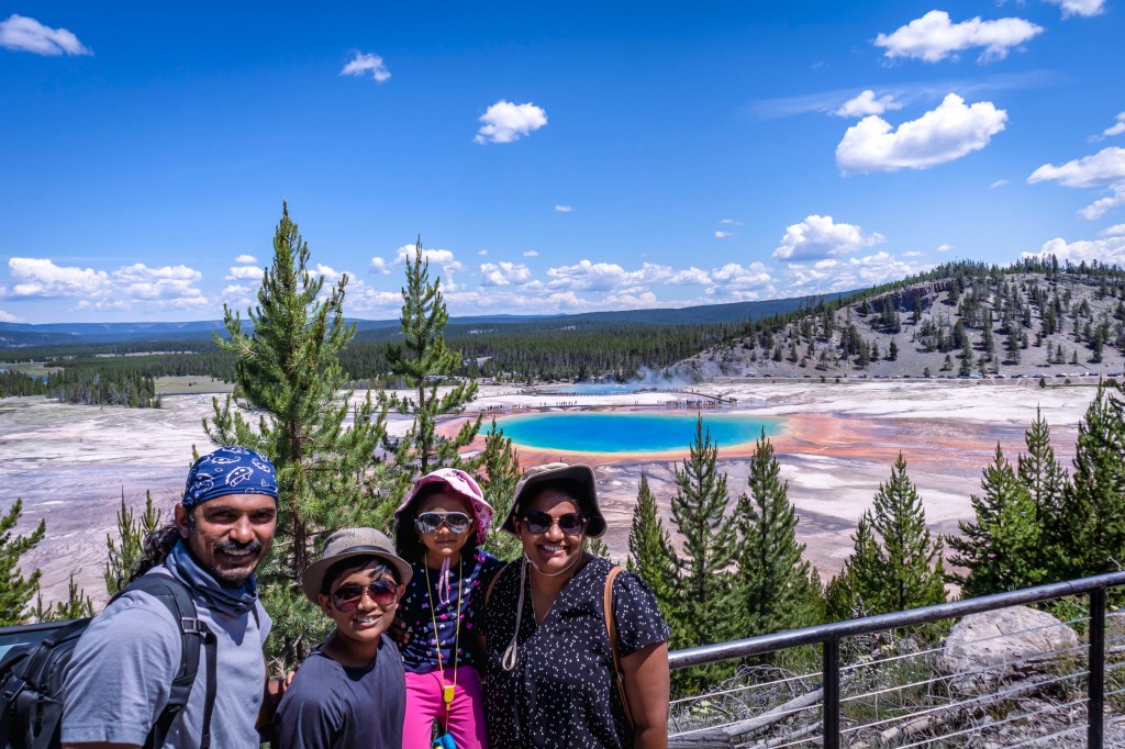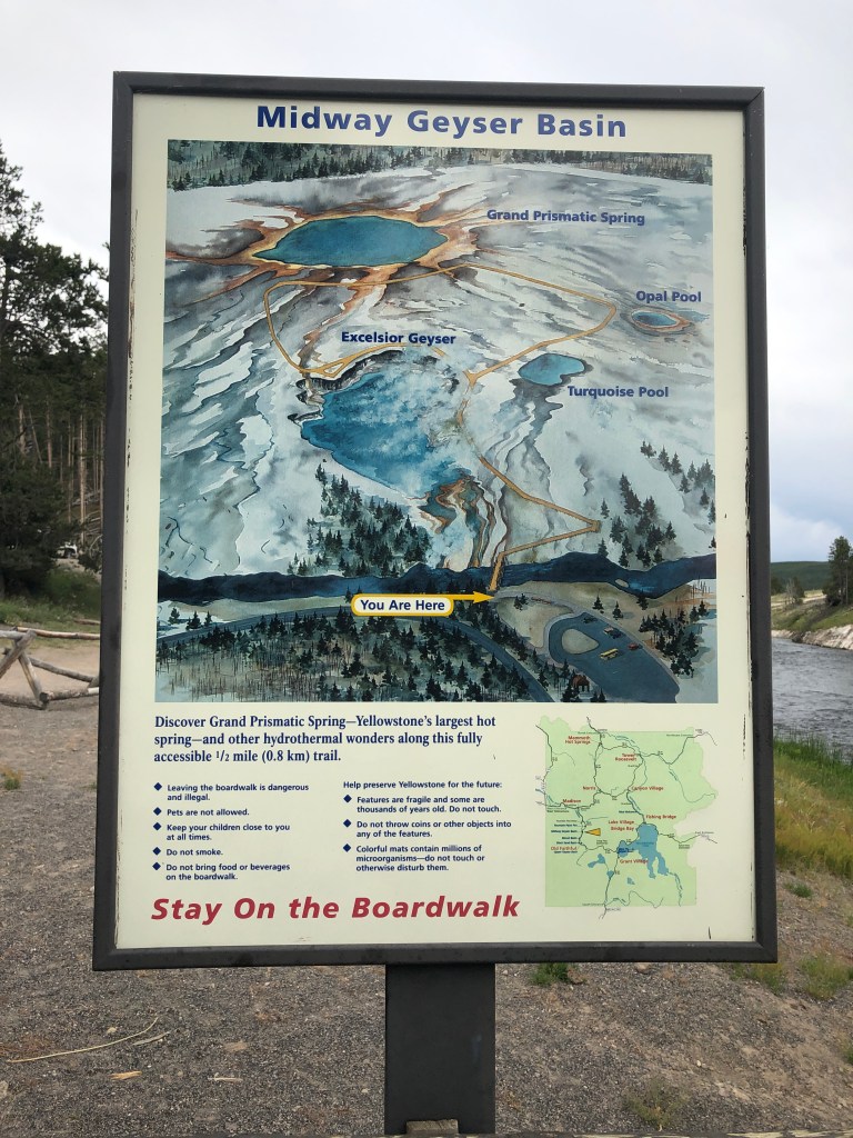 We got up early, ate breakfast, and headed to the Midway Geyser Basin. We were headed there to see the Grand Prismatic Spring. Now I know what you are thinking, “You guys already saw the Grand Prismatic Spring!”. Well, we only saw it at ground level and not from high above. And seeing The Grand Prismatic Spring from high above is really something.