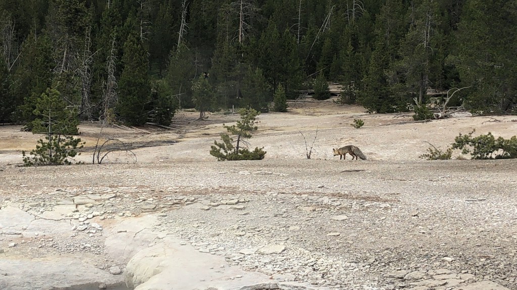 Before we got to the next geyser, we saw a fabulous sight. Or rather, someone else saw it and then we saw it too. As we were walking down the trail, a person told us that there was a fox over in the tree-line. When we turned to tell him thank you, he was gone! Spooky. But the fox was grey even though his species is classified as a red fox. I found out that the fox’s name was the Rocky Mountain Red Fox (Vulpes Vulpes Macroura).