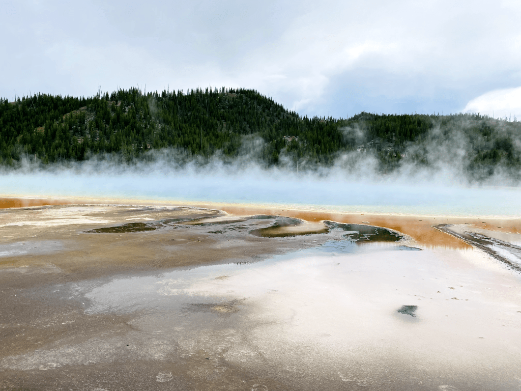 The Grand Prismatic Spring is a big hot-spring with the dimensions of 250×380 ft and has a depth of 160 ft. As the name suggests, it is a colorful hot-spring, though you can only see the colors from the       lookout point and not on the boardwalk. You can, however, see the blue of the water being reflected in the fog.
