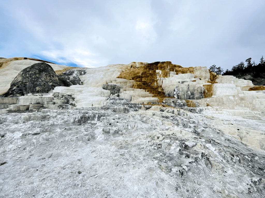 Next we saw the Mound and Jupiter Spring. Mound Spring was named because it looked like, well, a mound, and Jupiter Spring was named after the Roman God of the sky and the king of all other Roman gods. Both springs fluctuate in activity and Jupiter Spring actually dried up in 1998 but not before dumping huge amounts of water in 1980, sometimes even going over the boardwalk. The trees turned rock solid because of the sinter in their system at Mammoth Hot Springs and only some plant life grow there now because of the sinter covering the ground.