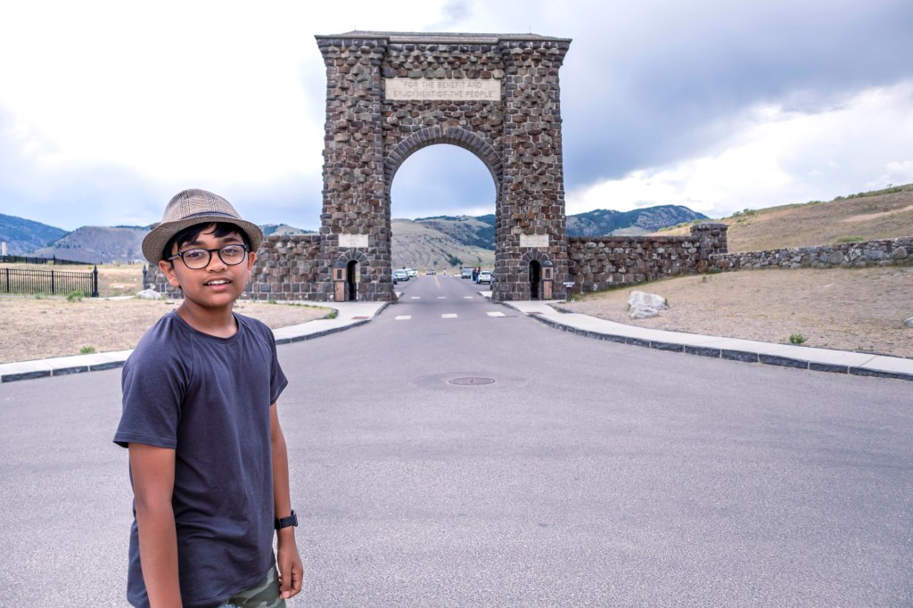 But if a Park Ranger from Yellowstone is reading this, I name these pools the Twin Prismatic Springs. The Fairy Falls trail (up to the Grand Prismatic Spring) was 1.2 miles long and this overlook was recently made. After the overlook, we went back to the parking lot to go to our next destination, the Roosevelt Arch. We did not go to the Fairy Falls, but we heard that it is a wonderful waterfall and we hope to go there next year.