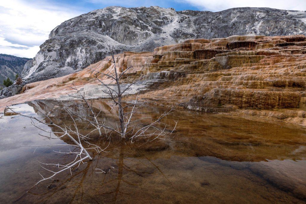 The water for the Mammoth Hot Spring comes from the Norris Geyser Basin, along a fault line according to Wikipedia, but the National Park Service says that the water comes from the rain and snow that seeps underground, and from there it is heated and goes to the features of Yellowstone, including Mammoth Hot Springs. All these facts were amazing, but the most amazing fact was that a tree was buried alive in travertine from the Mound Hot Spring; if you go there you can still see it.