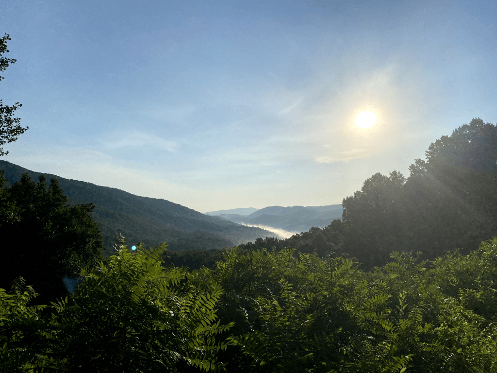We woke up Way, Way, early in the morning. We were gonna go to the Great Smoky Mountains National park today. And as we started out, it was certainly smoky outside. The “smoke” is actually highly volatile water and hydrocarbons exuded by nearby vegetation. Once you get inside the park, the roads climb elevation really quickly so we had a clear view of the “smoke” climbing up the mountain side.